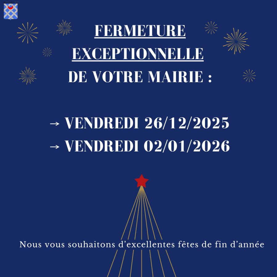 Actualités Accueil Vivre à Plélan Actualités Fermeture exceptionnelle de votre mairie les vendredis 26/12/25 et 02/01/26 Retour Ecouter Fermeture exceptionnelle de votre mairie les vendredis 26/12/25 et 02/01/26
