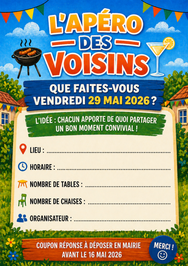 Actualités Tabls et chaises gratuites à disposition: il suffit de désigner un référent qui remet le coupon en mairie Accueil Vivre à Plélan Actualités Fête des Voisins : Vendredi 29 mai 2026 Retour Ecouter Fête des Voisins : Vendredi 29 mai 2026